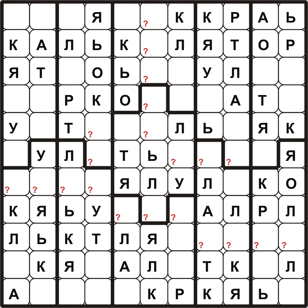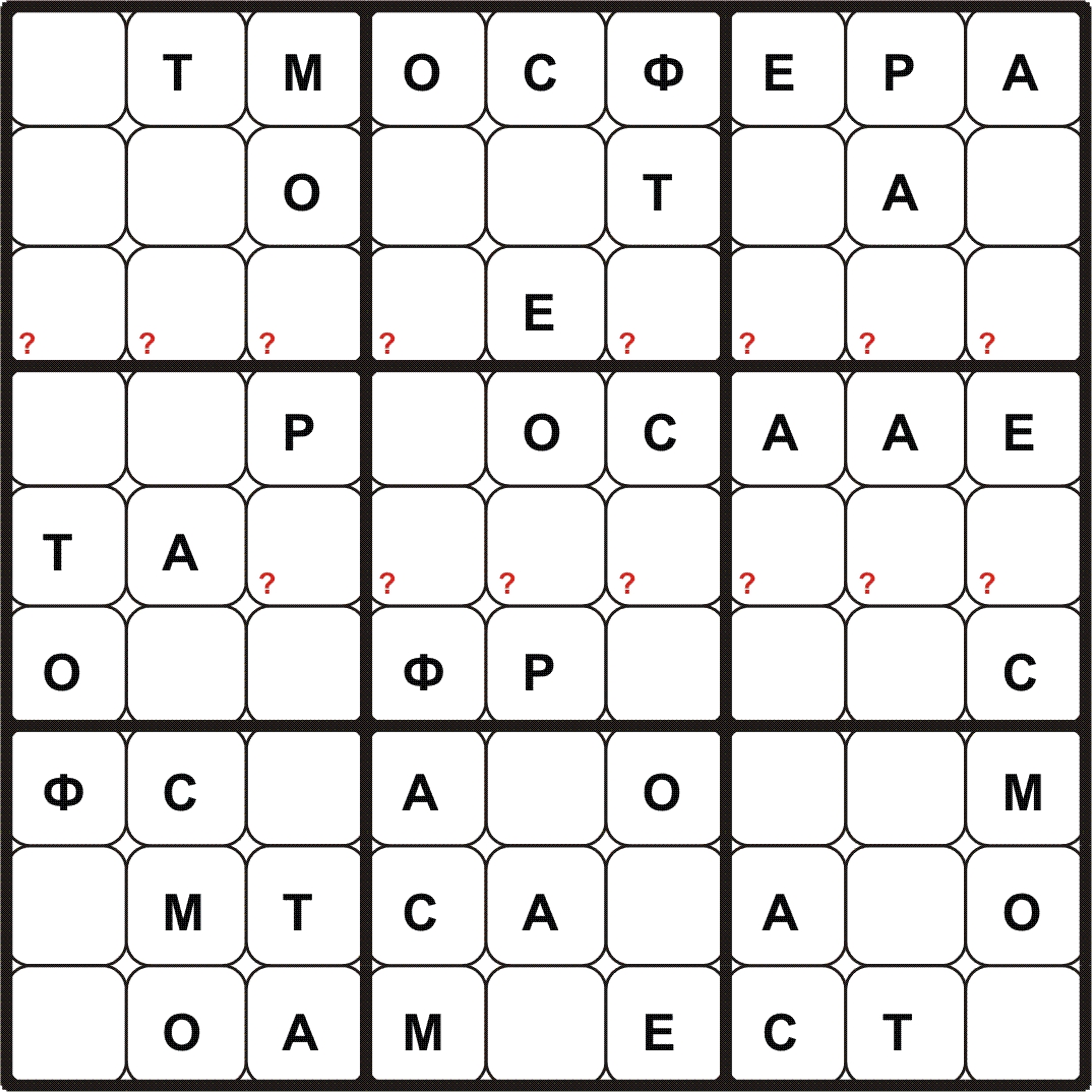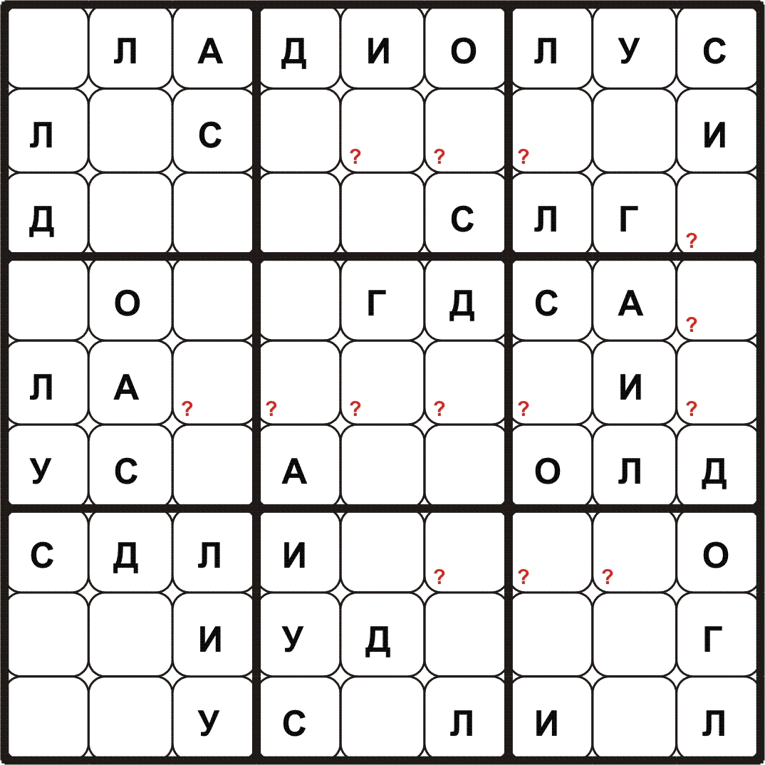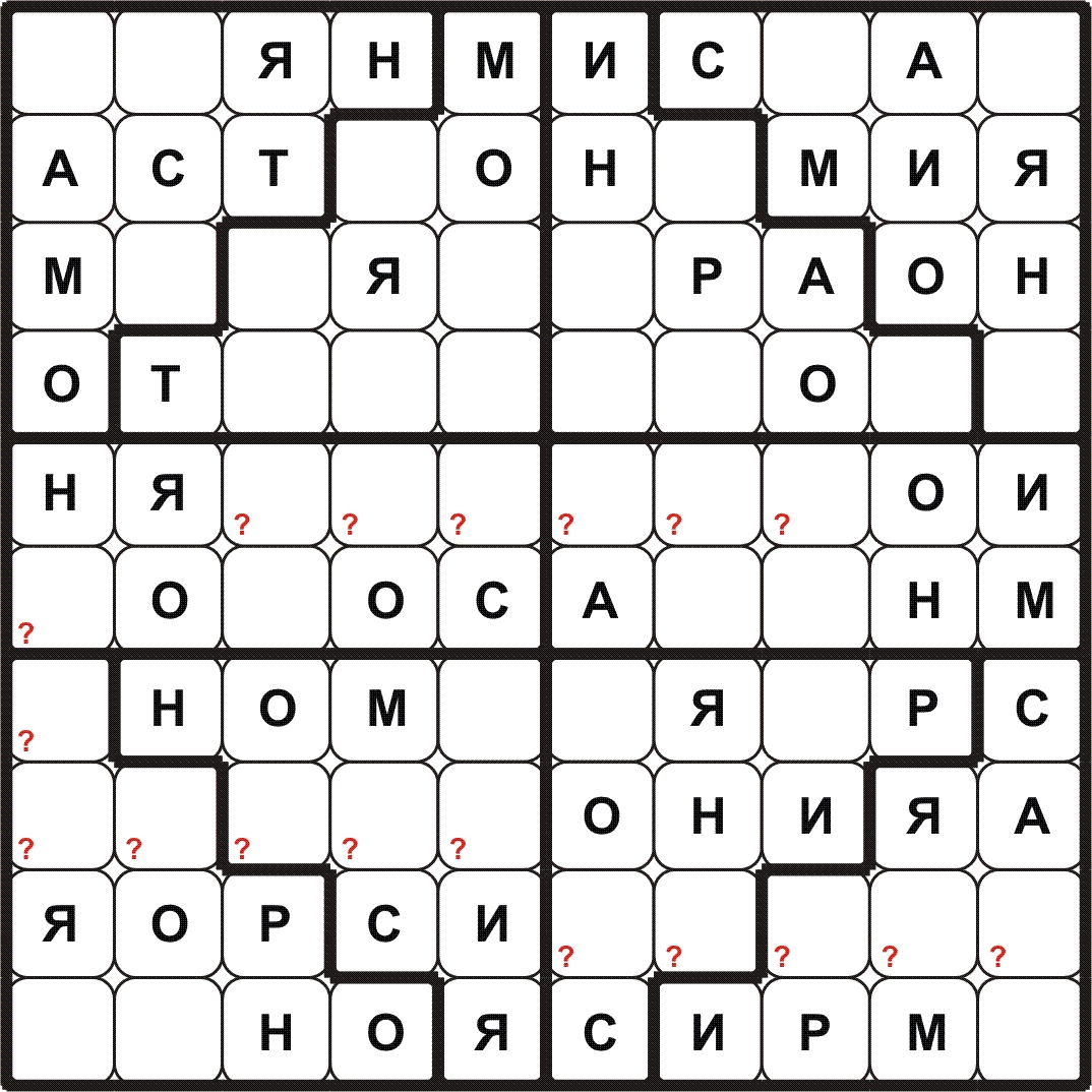 BUDOKU\БУДОКУ – доработанное судоку: нужно разместить все символы заданного слова\фразы в каждой строке, столбце, выделенном блоке и определить контрольные слова в клетках с (?). Путей решения с применением различных способов может быть много.