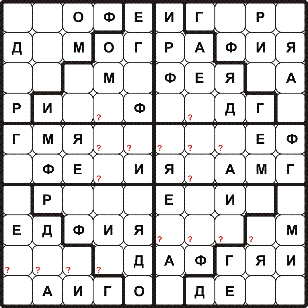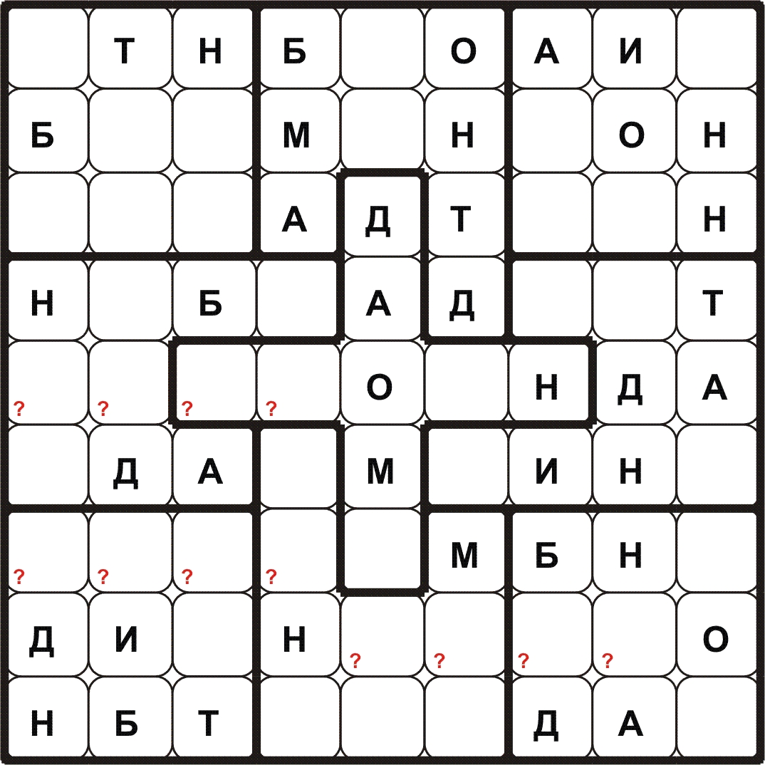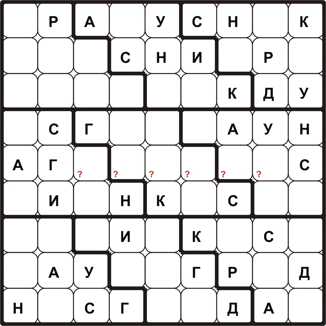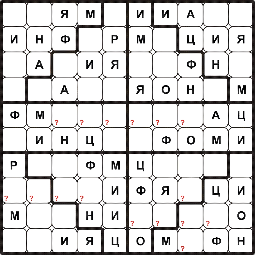 BUDOKU\БУДОКУ – доработанное судоку: нужно разместить все символы заданного слова\фразы в каждой строке, столбце, выделенном блоке и определить контрольные слова в клетках с (?). Путей решения с применением различных способов может быть много.
