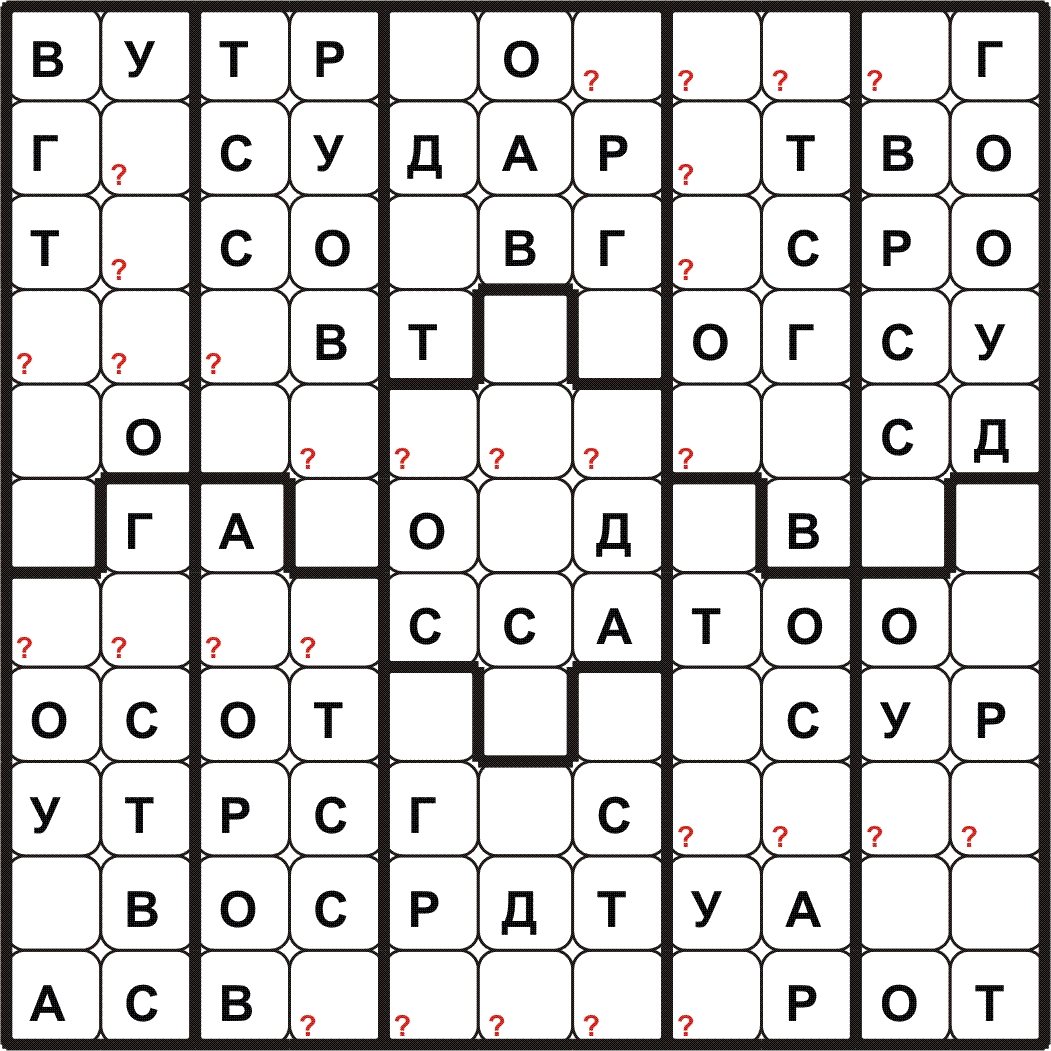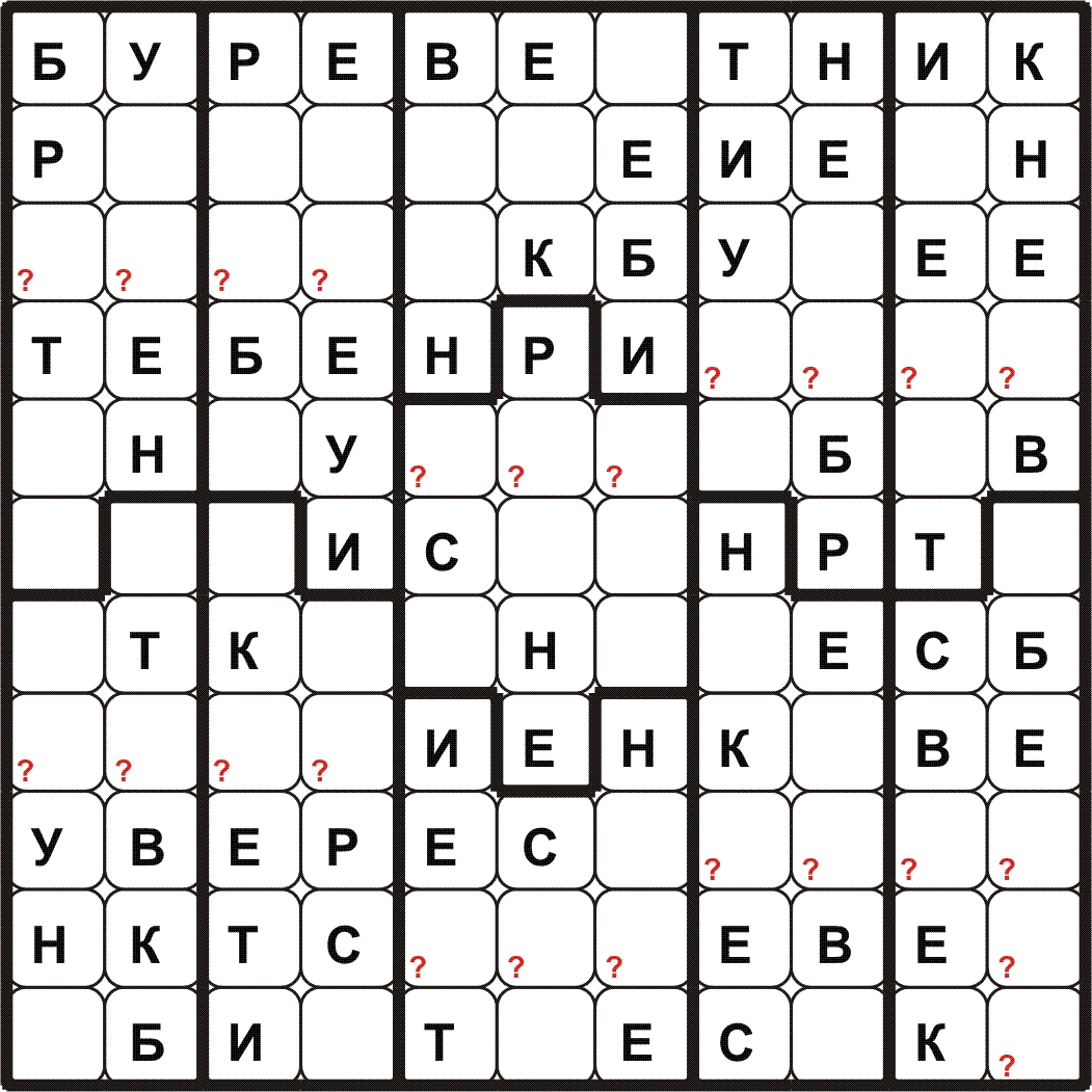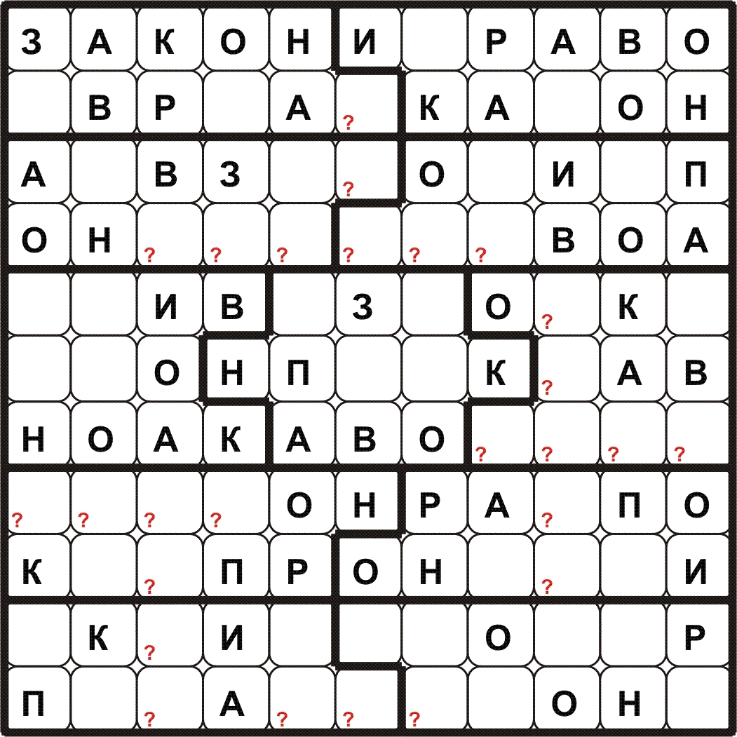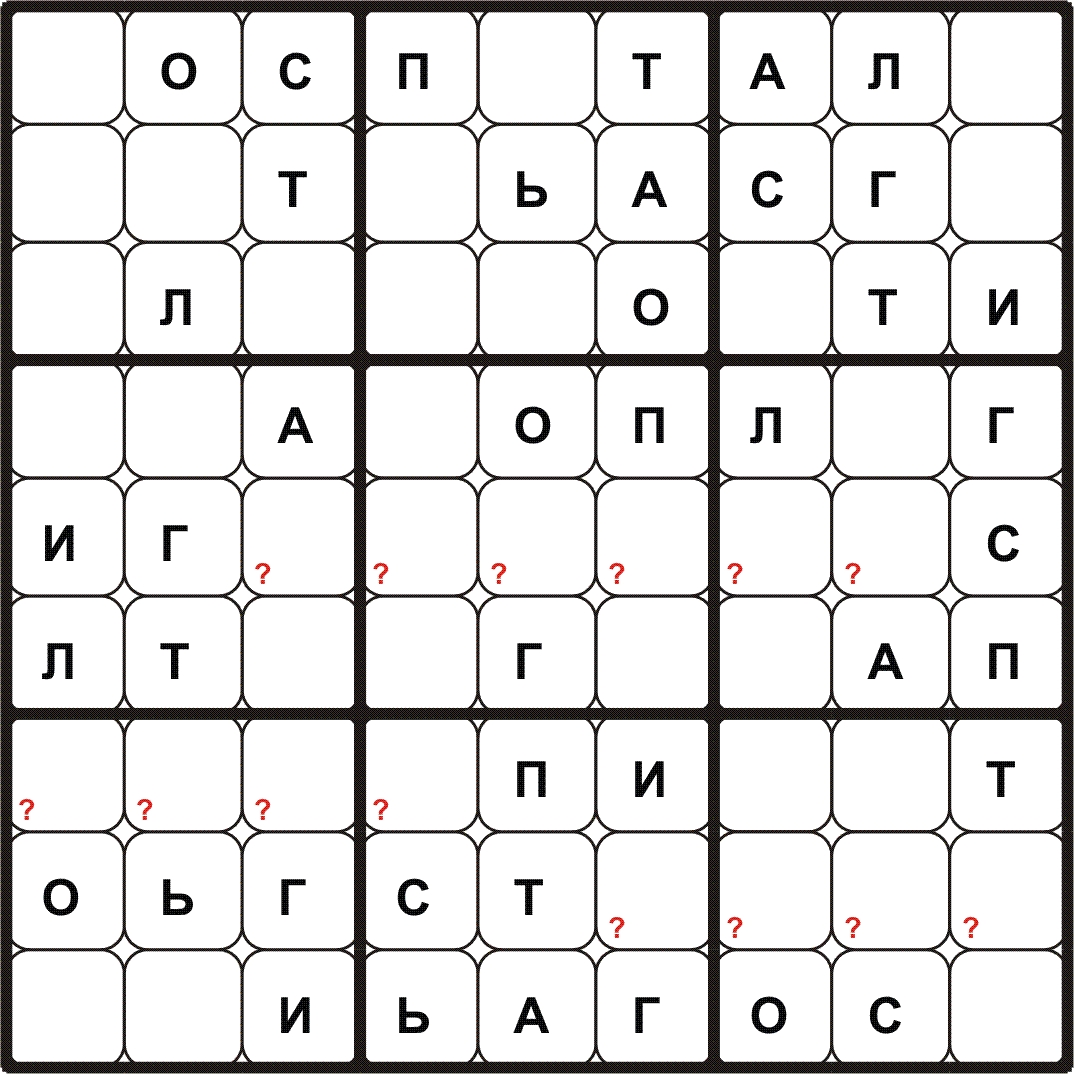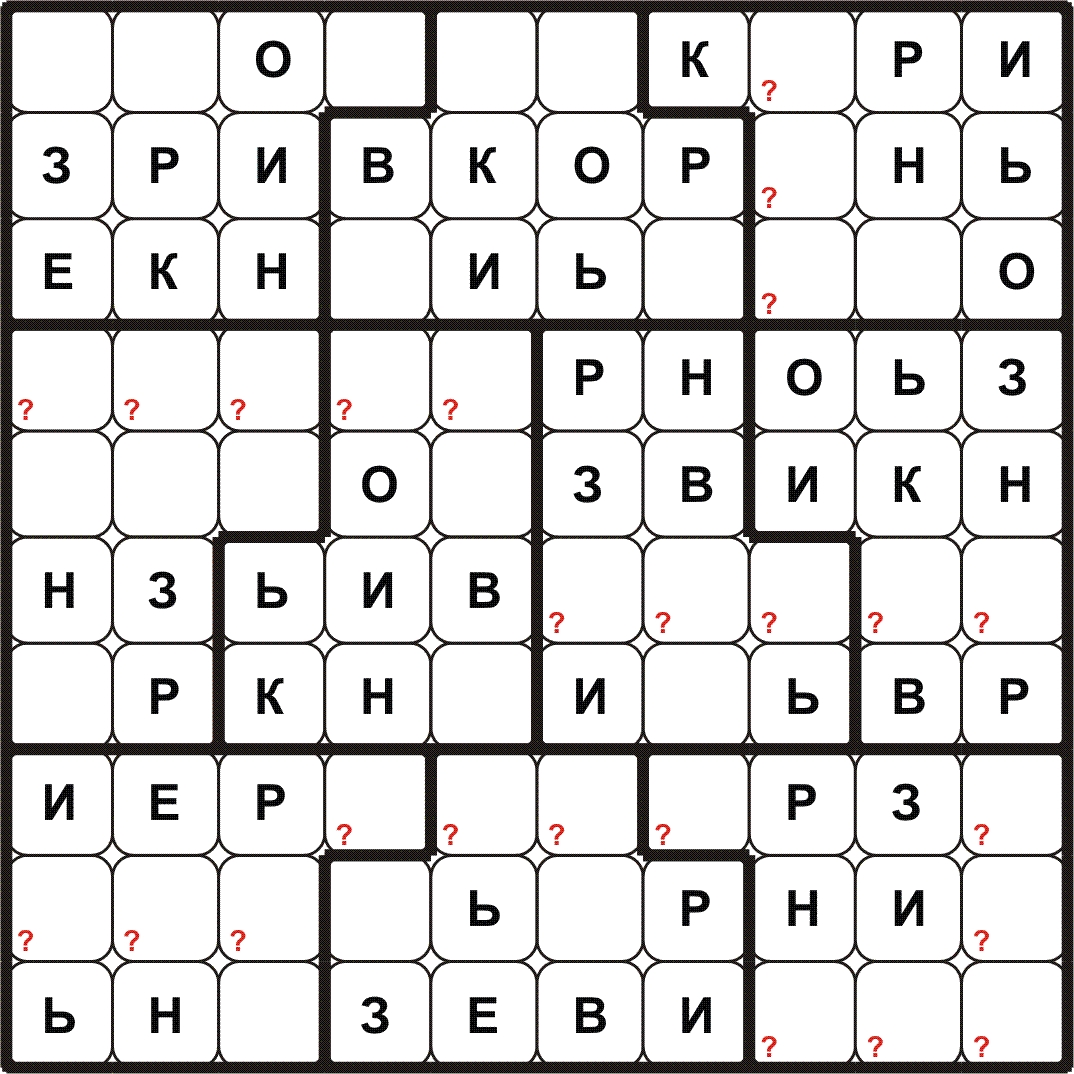 BUDOKU\БУДОКУ – доработанное судоку: нужно разместить все символы заданного слова\фразы в каждой строке, столбце, выделенном блоке и определить контрольные слова в клетках с (?). Путей решения с применением различных способов может быть много.