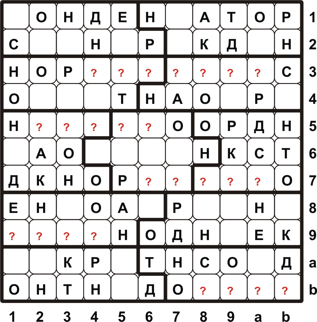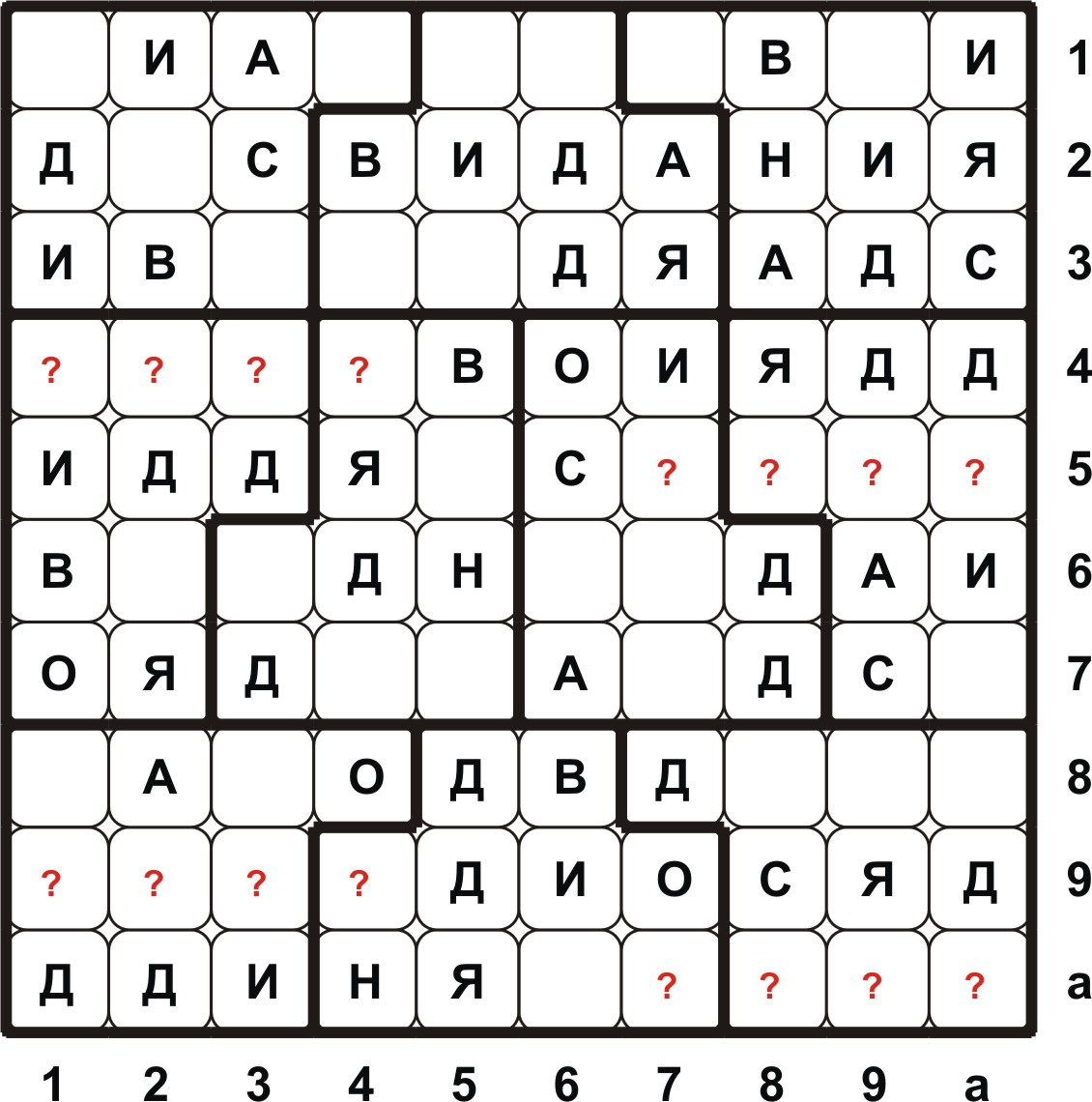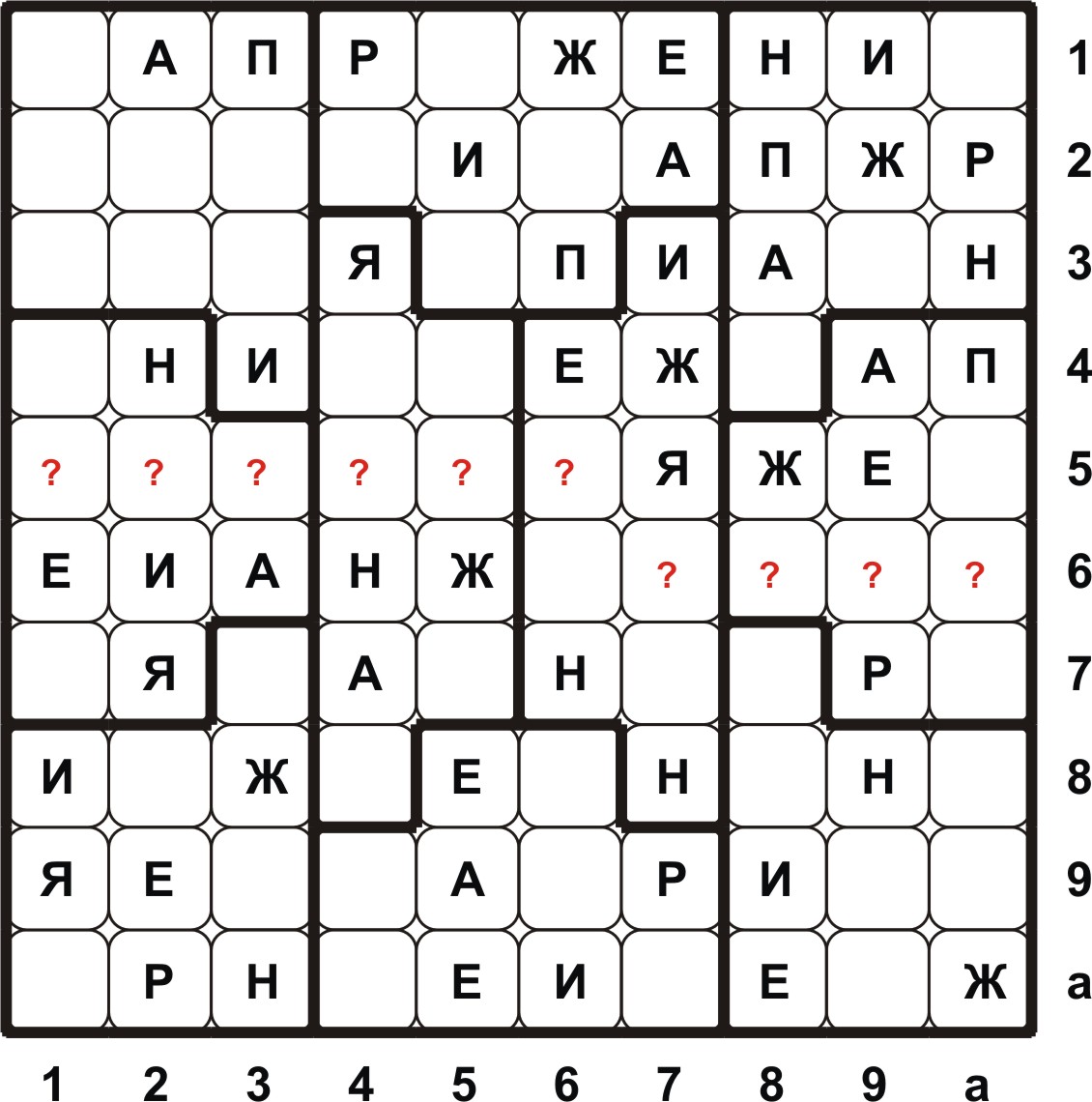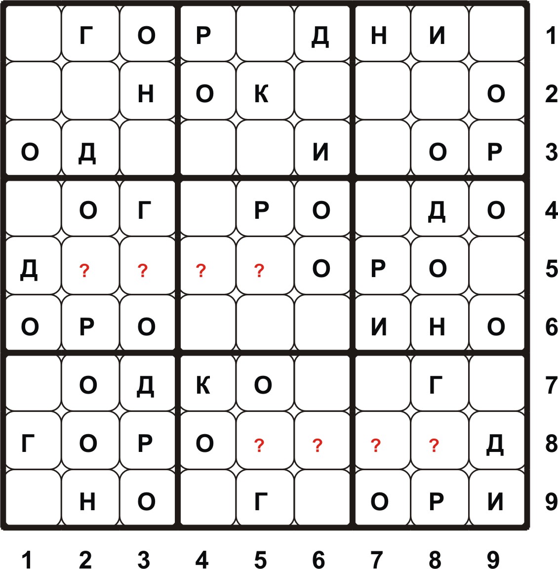 BUDOKU\БУДОКУ – похоже на судоку: нужно разместить ВСЕ символы заданного слова\фразы в каждой строке, столбце, блоке и определить контрольные слова в клетках с (?).
