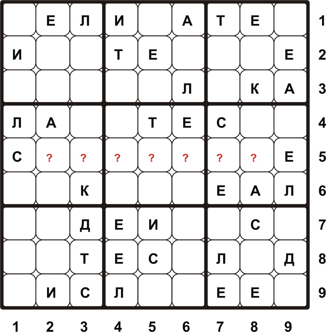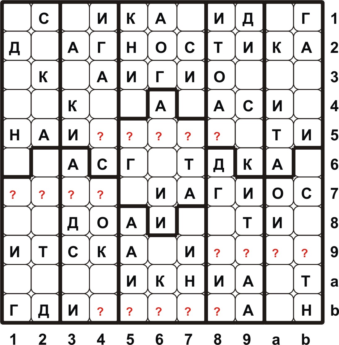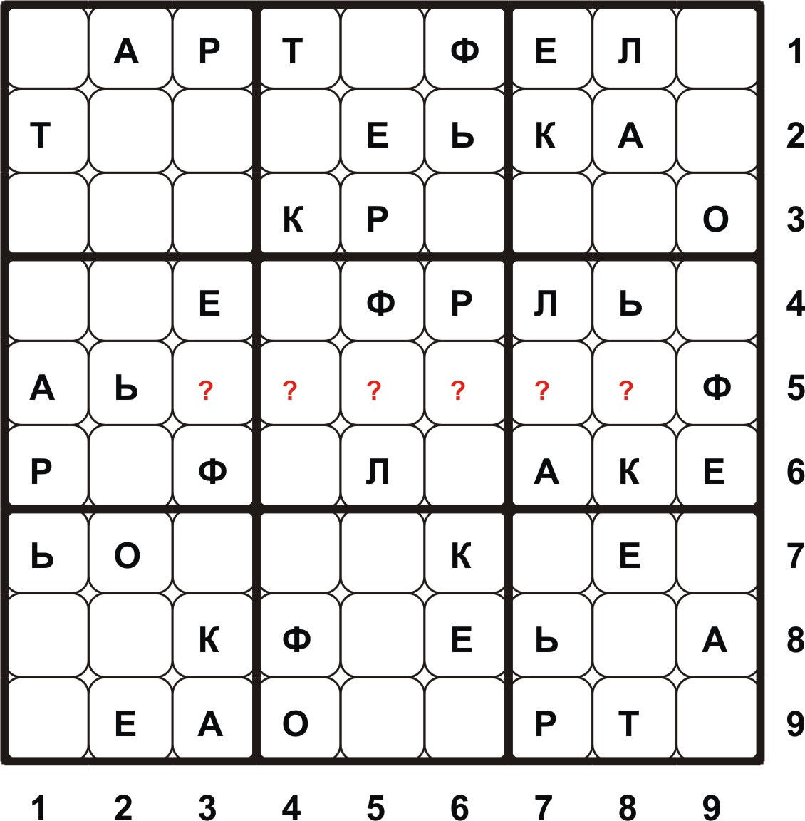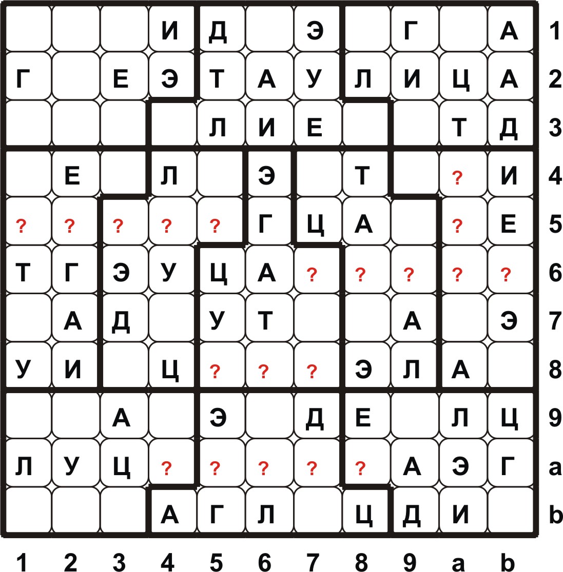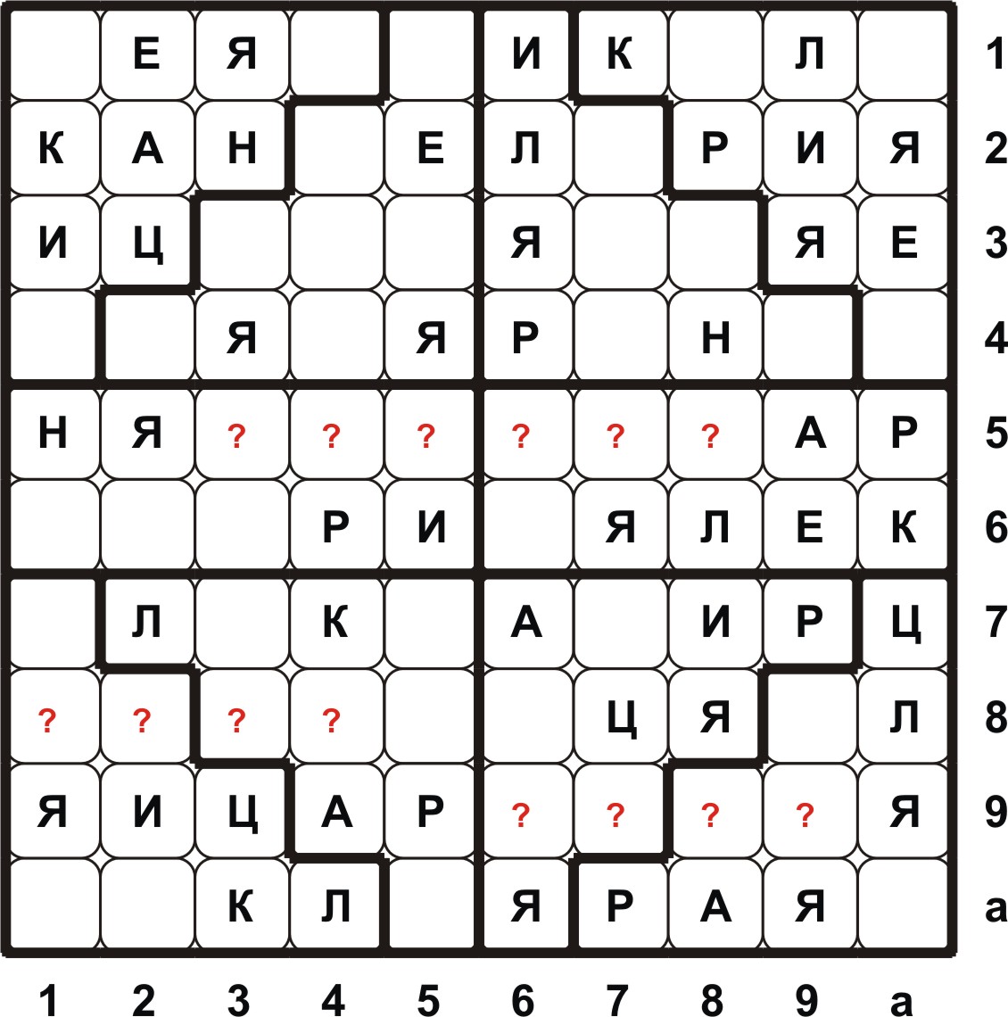 BUDOKU\БУДОКУ – похоже на судоку: нужно разместить ВСЕ символы заданного слова\фразы в каждой строке, столбце, блоке и определить контрольные слова в клетках с (?).
