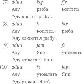 Более того, если расширить кругозор, окажется, что это не невозможная черта. Например, именно так устроено время в языке аттие (Кот-д'Ивуар){7}. Вот несколько примеров предложений на этом языке (в упрощенной транскрипции), из которых видно, что в этом языке в настоящем времени используется порядок слов Подлежащее – Дополнение – Сказуемое, а в прошедшем времени – Подлежащее – Сказуемое – Дополнение{8}: