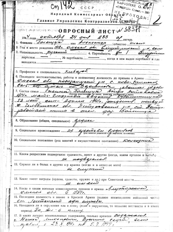 Через несколько дней из Тюмени пришёл пакет. Это была копия протокола допроса Полещука Александра Ильича, техника-интенданта 1 ранга (то есть, старшего лейтенанта административной службы) оперуполномоченным контрразведки «Смерш» спецлагеря №283 лейтенантом Ткачёвым. На каждой из восьми страниц Опросного листа стояла удостоверяющая подпись отца, хорошо знакомая мне по его сохранившимся письмам и документам. Опросный лист имел порядковый номер 38371.