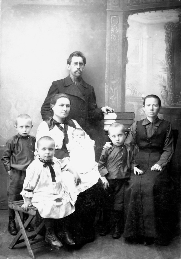 У меня хранится большая фотография, сделанная в Ялуторовске в 1917 году. На ней Илья Ефимович, в аккуратной бородке и пенсне, похожий на Чехова, стоит, положив руку на стопку книг – знак принадлежности к учёному сословию. Перед ним сидит в кресле Евдокия Кузьминична с маленькой Тамарой на руках, рядом с ней Лёня и Катя. А по другую сторону от Евдокии Кузьминичны обнимает за плечи моего будущего отца его крёстная мать. У него не по-детски серьёзные глаза, и мне видится в них кроткая готовность принять любую судьбу…