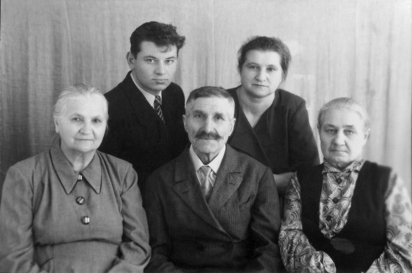 Фото на память о приезде в Петухово бабушки из Ялуторовска. В первом ряду – Ксения Васильевна Савранская, Антон Никодимович Савранский и Евдокия Кузьминична Глазунова. Позади них я и мама, Анна Антоновна Полещук. 1957 г.