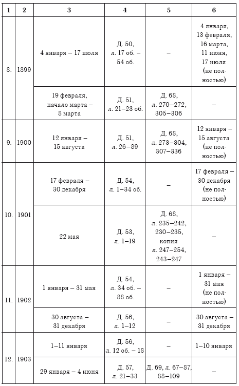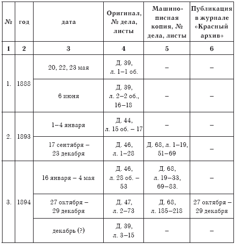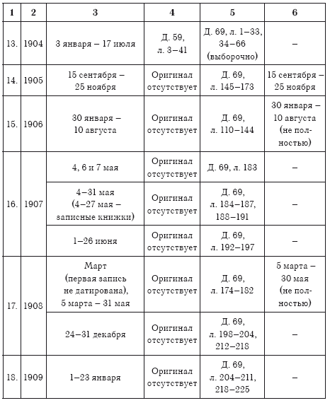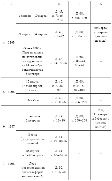 В качестве итога проделанной работы ниже приведена сводная хронологическая таблица-реконструкция дневника за 1893–1909 гг.