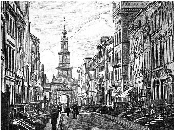 Услышав визг, возница приударил вожжами, и повозка споро задребезжала по булыжной мостовой. Она миновала Гусиный кран, на котором восседал Пётр, и промчалась к крепостной стене Старого города, Альтштадта.