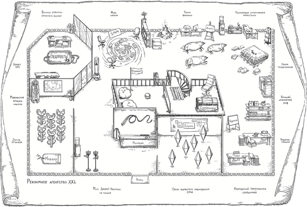 Путь к Сокровищнице проходит через винтовую лестницу в центре агентского опенспейса. Это, во-первых, красиво: кто не мечтал иметь собственную лестницу посреди комнаты? Во-вторых, практично: люди – существа ленивые, а творческие люди – вершина этой пирамиды лени. Когда нужно подняться куда-то по лестнице, чтобы задать вопрос – они серьезно подумают о том, стоит ли вообще задавать вопрос. И с большой вероятностью найдут решение сами. Таким образом, расположение руководителя на другом ярусе – отличный тактический ход, заметно уменьшающий количество необязательных вопросов.