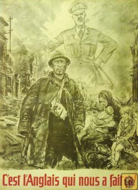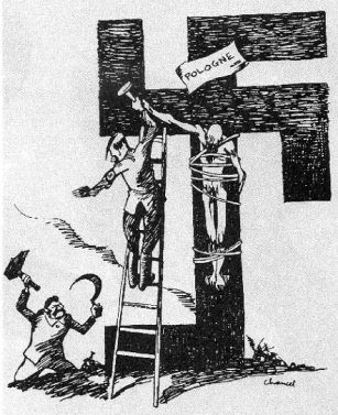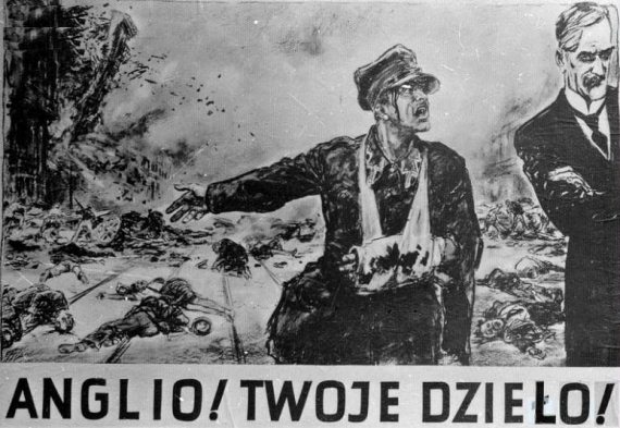 Польский солдат предъявляет претензию джентльмену, похожему на британского премьера: «Англия! Твоих рук дело!». Аналогичное озарение снизошло и на французского военнослужащего: «Это все англичане сделали!».