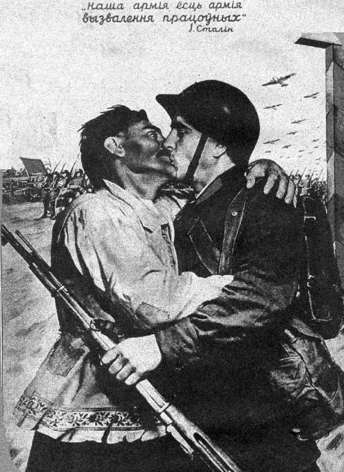 Такой твердый курс выгодно контрастировал с политикой «империалистических хищников», напоминавшей движения известной субстанции в проруби: они «сливали» своих союзников (как «примкнувшую» к англо-французскому блоку Чехословакию). «Освоение» Австрии и Чехословакии окрепшей Германией вызвало неудовольствие «плутократий» и даже Муссолини (союзника фюрера по Стальному пакту), но тем острее было наслаждение польских «друзей», урвавших свой «чешский кусок». В адрес «гоноровых панов» с британских берегов раздалось обидное: «европейские гиены!». Потом, правда, вышли слезоточивые книжонки, одна – с характерным названием «Изнасилование Польши». Однако, наблюдая двойное проникновение в Речь Посполиту фюрера, а также «вождя и полководца всех времен и народов», не забыли приказать англо-французским войскам «Обождать!», несмотря на данные Польше незадолго до этих событий гарантии безопасности. Экзерсисы этой «большой европейской политики» закончились плохо – во всяком случае, для тех, кого не отделял от прущих вперед германских танков Ла-Манш (рис. 1.20). Ну, а дружба СССР и Германии была не только «глубинной», идеологической, но и крепкой, солдатской (рис. 1.21).