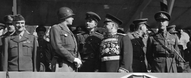 На параде Победы в Берлине. В центре – генерал Дж. Паттон и маршал Г. Жуков, между ними – майор Б. Прищепенко; слева – американский генерал Л. Клей, справа – британский генерал Р. Робертсон