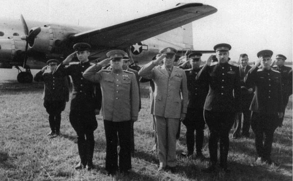 Генерал Д. Эйзенхауэр, впоследствии – президент США в качестве гостя маршала Жукова. Встреча на Центральном аэродроме Москвы. Второй слева – майор Прищепенко