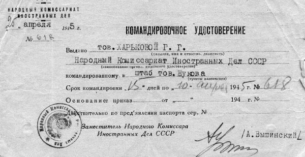 Гита Харькова тоже была командирована в штаб маршала Жукова, но другим ведомством – Министерством иностранных дел. Ее документы (рис. 1.26) подписал заместитель министра А. Вышинский, в недалеком прошлом – Генеральный прокурор СССР. Гитлер, когда хотел поощрить Роланда Фрайслера – штамповавшего смертные приговоры председателя своего карманного Народного суда – называл его «нашим Вышинским», но Фрайслеру было далеко до масштабов советского коллеги. В 1945 году готовился Международный трибунал над германскими военными преступниками и Г иге предстояло работать там переводчицей – она в совершенстве знала немецкий язык, проведя детство в Германии.