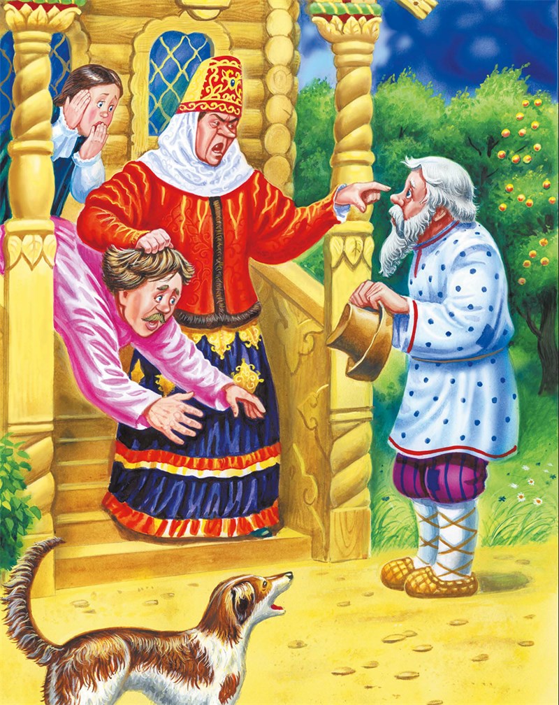 Жил старик со своею старухойУ самого синего моря;Они жили в ветхой землянкеРовно тридцать лет и три года.Старик ловил неводом рыбу,Старуха пряла свою пряжу.Раз он в море закинул невод, —Пришёл невод с одною тиной.Он в другой раз закинул невод, —Пришёл невод с травой морскою.В третий раз закинул он невод, —Пришёл невод с одною рыбкой,С непростою рыбкой, – золотою.Как взмолится золотая рыбка!Голосом молвит человечьим:«Отпусти ты, старче, меня в море,Дорогой за себя дам откуп:Откуплюсь чем только пожелаешь».Удивился старик, испугался:Он рыбачил тридцать лет и три годаИ не слыхивал, чтоб рыба говорила.Отпустил он рыбку золотуюИ сказал ей ласковое слово:«Бог с тобою, золотая рыбка!Твоего мне откупа не надо;Ступай себе в синее море,Гуляй там себе на просторе».Воротился старик ко старухе,Рассказал ей великое чудо.«Я сегодня поймал было рыбку,Золотую рыбку, не простую;По-нашему говорила рыбка,Домой в море синее просилась,Дорогою ценою откупалась:Откупалась чем только пожелаю.Не посмел я взять с неё выкуп;Так пустил её в синее море».Старика старуха забранила:«Дурачина ты, простофиля!Не умел ты взять выкупа с рыбки!Хоть бы взял ты с неё корыто,Наше-то совсем раскололось».Вот пошёл он к синему морю;Видит, – море слегка разыгралось.Стал он кликать золотую рыбку,Приплыла к нему рыбка и спросила:«Чего тебе надобно, старче?»Ей с поклоном старик отвечает:«Смилуйся, государыня рыбка,Разбранила меня моя старуха,Не даёт старику мне покою:Надобно ей новое корыто;Наше-то совсем раскололось».Отвечает золотая рыбка:«Не печалься, ступай себе с богом,Будет вам новое корыто».Воротился старик ко старухе,У старухи новое корыто.Ещё пуще старуха бранится:«Дурачина ты, простофиля!Выпросил, дурачина, корыто!В корыте много ль корысти?Воротись, дурачина, ты к рыбке;Поклонись ей, выпроси уж избу».Вот пошёл он к синему морю,(Помутилося синее море.)Стал он кликать золотую рыбку,Приплыла к нему рыбка, спросила:«Чего тебе надобно, старче?»Ей старик с поклоном отвечает:«Смилуйся, государыня рыбка!Ещё пуще старуха бранится,Не даёт старику мне покою:Избу просит сварливая баба».Отвечает золотая рыбка:«Не печалься, ступай себе с богом,Так и быть: изба вам уж будет».Пошёл он ко своей землянке,А землянки нет уж и следа;Перед ним изба со светёлкой[1],С кирпичною, белёною трубою,С дубовыми, тесовыми вороты[2].Старуха сидит под окошком,На чём свет стоит мужа ругает.«Дурачина ты, прямой простофиля!Выпросил, простофиля, избу!Воротись, поклонися рыбке:Не хочу быть чёрной крестьянкой,Хочу быть столбовою дворянкой[3]».Пошёл старик к синему морю;(Не спокойно синее море.)Стал он кликать золотую рыбку.Приплыла к нему рыбка, спросила:«Чего тебе надобно, старче?»Ей с поклоном старик отвечает:«Смилуйся, государыня рыбка!Пуще прежнего старуха вздурилась,Не даёт старику мне покою:Уж не хочет быть она крестьянкой,Хочет быть столбовою дворянкой».Отвечает золотая рыбка:«Не печалься, ступай себе с богом».Воротился старик ко старухе.Что ж он видит? Высокий терем[4].На крыльце стоит его старухаВ дорогой собольей душегрейке[5],Парчовая на маковке[6] кичка[7],Жемчуги огрузили шею,На руках золотые перстни,На ногах красные сапожки.Перед нею усердные слуги;Она бьёт их, за чупрун[8] таскает.Говорит старик своей старухе:«Здравствуй, барыня сударыня дворянка!Чай, теперь твоя душенька довольна».На него прикрик