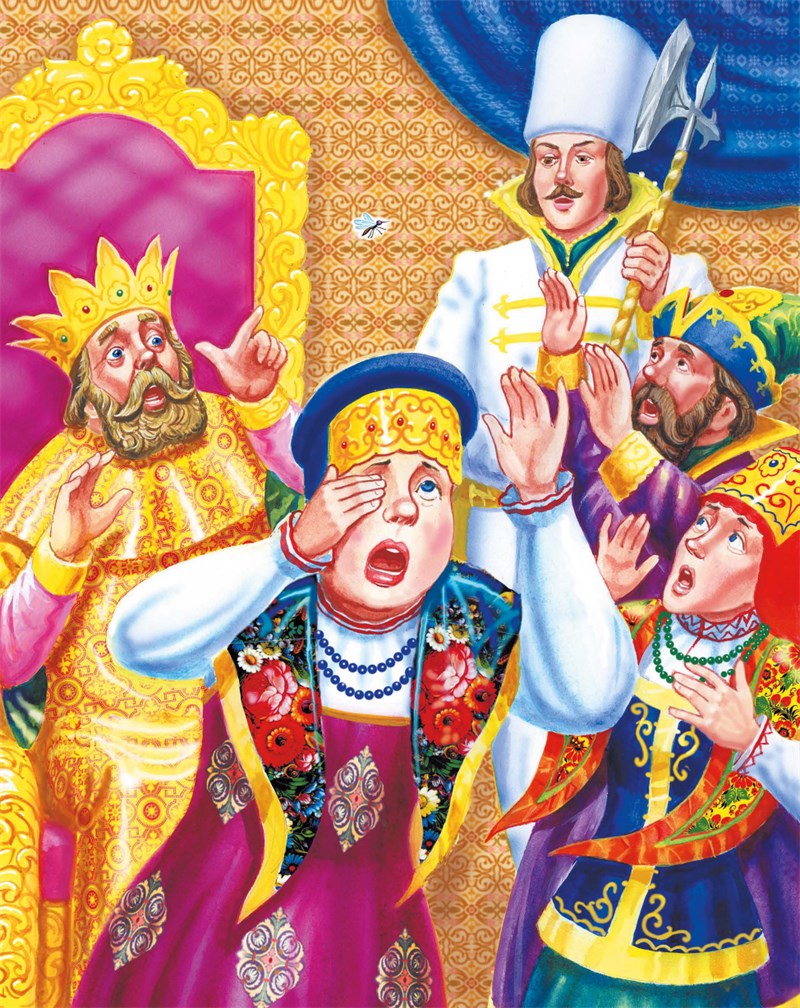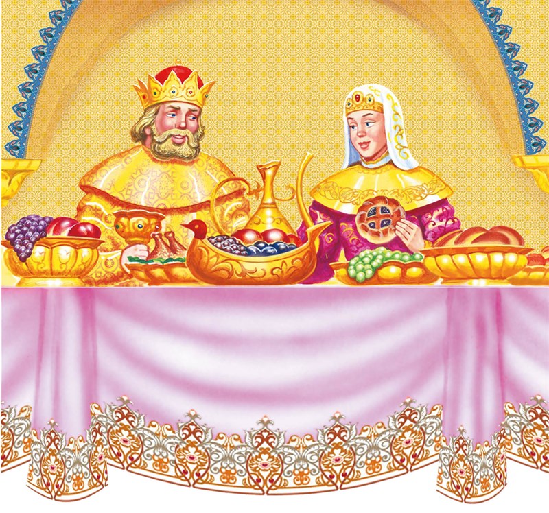 Обнимает он царицу,И сынка, и молодицу,И садятся все за стол;И весёлый пир пошёл.А ткачиха с поварихой,С сватьей бабой Бабарихой,Разбежались по углам;Их нашли насилу там.