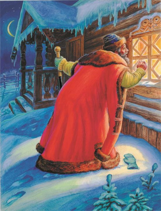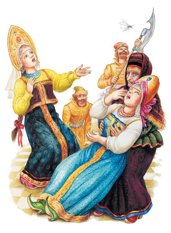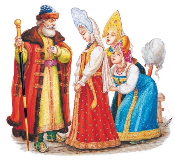 Только вымолвить успела,Дверь тихонько заскрыпела,И в светлицу входит царь,Стороны той государь.Во всё время разговораОн стоял позадь забора;Речь последней по всемуПолюбилася ему.«Здравствуй, красная девица, —Говорит он, – будь царицаИ роди богатыряМне к исходу сентября.Вы ж, голубушки-сестрицы,Выбирайтесь из светлицы,Поезжайте вслед за мной,Вслед за мной и за сестрой:Будь одна из вас ткачиха,А другая повариха».