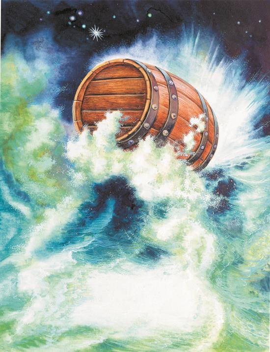 Едет с грамотой гонецИ приехал наконец.А ткачиха с поварихой,С сватьей бабой Бабарихой,Обобрать его велят;Допьяна гонца поятИ в суму его пустуюСуют грамоту другую —И привёз гонец хмельнойВ тот же день приказ такой:«Царь велит своим боярам,Времени не тратя даром,И царицу и приплодТайно бросить в бездну вод».Делать нечего: бояре,Потужив о государеИ царице молодой,В спальню к ней пришли толпой.Объявили царску волю —Ей и сыну злую долю,Прочитали вслух указ,И царицу в тот же часВ бочку с сыном посадили,Засмолили, покатилиИ пустили в Окиян —Так велел-де царь Салтан.
