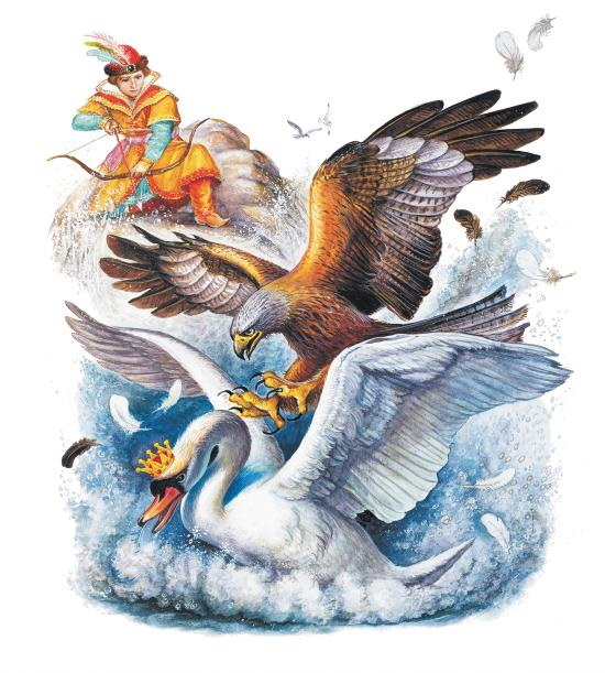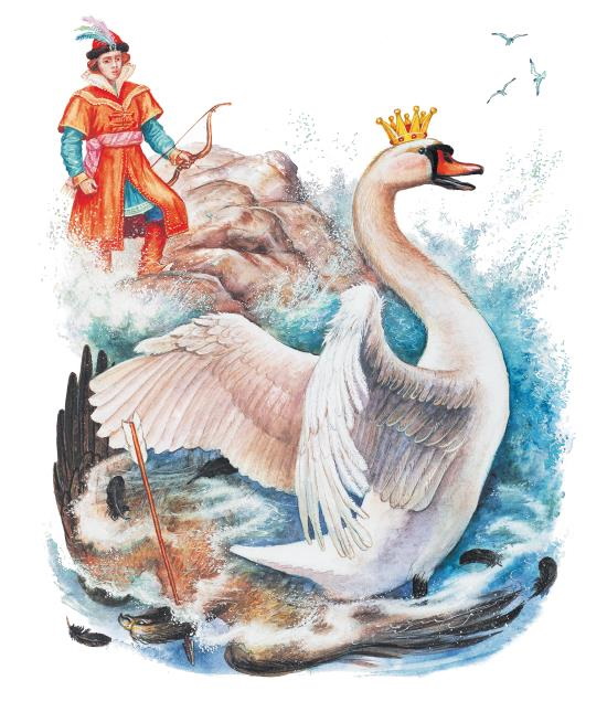 К морю лишь подходит он,Вот и слышит будто стон…Видно, нá море не тихо;Смотрит – видит дело лихо:Бьётся лебедь средь зыбей,Коршун носится над ней;Та бедняжка так и плещет,Воду вкруг мутит и хлещет…Тот уж когти распустил,Клёв кровавый навострил…Но как раз стрела запела —В шею коршуна задела —Коршун в море кровь пролил.Лук царевич опустил;Смотрит: коршун в море тонетИ не птичьим криком стонет,Лебедь около плывёт,Злого коршуна клюёт,Гибель близкую торопит,Бьёт крылом и в море топит —И царевичу потомМолвит русским языком:«Ты, царевич, мой спаситель,Мой могучий избавитель,Не тужи, что за меняЕсть не будешь ты три дня,Что стрела пропала в море;Это горе – всё не горе.Отплачу тебе добром,Сослужу тебе потом:Ты не лебедь ведь избавил,Дéвицу в живых оставил;Ты не коршуна убил,Чародея подстрелил.Ввек тебя я не забуду:Ты найдёшь меня повсюду,А теперь ты воротись,Не горюй и спать ложись».