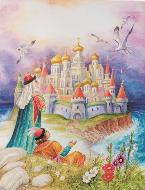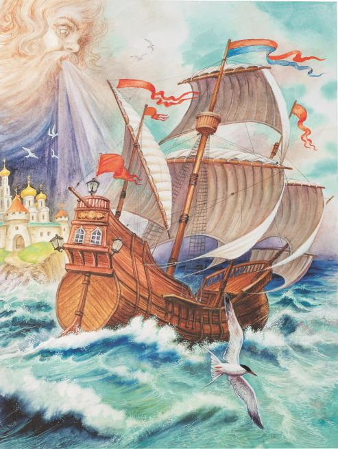 Ветер нá море гуляетИ кораблик подгоняет;Он бежит себе в волнахНа раздутых парусах.Корабельщики дивятся,На кораблике толпятся,На знакомом островуЧудо видят наяву:Город новый златоглавый,Пристань с крепкою заставой —Пушки с пристани палят,Кораблю пристать велят.Пристают к заставе гости;Князь Гвидон зовёт их в гости,Их он кормит и поитИ ответ держать велит:«Чем вы, гости, торг ведётеИ куда теперь плывёте?»Корабельщики в ответ:«Мы объехали весь свет,Торговали соболями,Чернобурыми лисами;А теперь нам вышел срок,Едем прямо на восток,Мимо острова Буяна,В царство славного Салтана…»