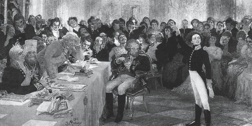 И. Репин. А.С. Пушкин на акте в Лицее 8 января 1815 года читает свою поэму «Воспоминания в Царском селе». 1911