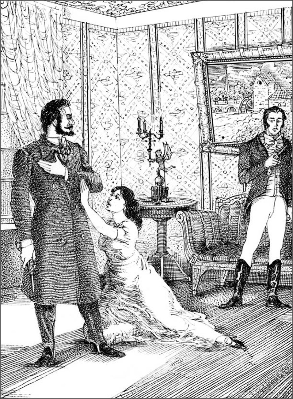 Лакей ввел меня в графский кабинет, а сам пошел обо мне доложить. Обширный кабинет был убран со всевозможною роскошью; около стен стояли шкафы с книгами, и над каждым бронзовый бюст; над мраморным камином было широкое зеркало; пол обит был зеленым сукном и устлан коврами. Отвыкнув от роскоши в бедном углу моем и уже давно не видав чужого богатства, я оробел и ждал графа с каким-то трепетом, как проситель из провинции ждет выхода министра. Двери отворились, вошел мужчина лет тридцати двух, прекрасный собою. Граф приблизился ко мне с видом открытым и дружелюбным; я старался ободриться и начал было себя рекомендовать, но он предупредил меня. Мы сели. Разговор его, свободный и любезный, вскоре рассеял мою одичалую застенчивость; я уже начинал входить в обыкновенное мое положение, как вдруг вошла графиня, и смущение овладело мною пуще прежнего. В самом деле, она была красавица. Граф представил меня; я хотел казаться развязным, но чем больше старался взять на себя вид непринужденности, тем более чувствовал себя неловким. Они, чтоб дать мне время оправиться и привыкнуть к новому знакомству, стали говорить между собою, обходясь со мною как с добрым соседом и без церемонии. Между тем я стал ходить взад и вперед, осматривая книги и картины. В картинах я не знаток, но одна привлекла мое внимание. Она изображала какой-то вид из Швейцарии; но поразила меня в ней не живопись, а то, что картина была прострелена двумя пулями, всаженными одна на другую.