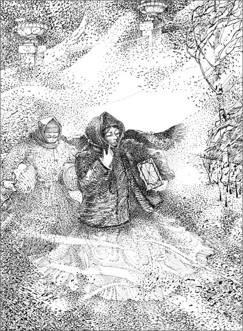 Подали ужинать; сердце ее сильно забилось. Дрожащим голосом объявила она, что ей ужинать не хочется, и стала прощаться с отцом и матерью. Они ее поцеловали и, по обыкновению, благословили; она чуть не заплакала. Пришед в свою комнату, она кинулась в кресла и залилась слезами. Девушка уговаривала ее успокоиться и ободриться. Все было готово. Через полчаса Маша должна была навсегда оставить родительский дом, свою комнату, тихую девическую жизнь… На дворе была метель; ветер выл, ставни тряслись и стучали; все казалось ей угрозой и печальным предзнаменованием. Скоро в доме все утихло и заснуло. Maшa окуталась шалью, надела теплый капот, взяла в руки шкатулку и вышла на заднее крыльцо. Служанка несла за нею два узла. Они сошли в сад. Метель не утихала; ветер дул навстречу, как будто силясь остановить молодую преступницу. Они насилу дошли до конца сада. На дороге сани дожидались их. Лошади, прозябнув, не стояли на месте; кучер Владимира расхаживал перед оглоблями, удерживая ретивых. Он помог барышне и ее девушке усесться и уложить узлы и шкатулку, взял вожжи, и лошади полетели. Поручив барышню попечению судьбы и искусству Терешки-кучера, обратимся к молодому нашему любовнику.