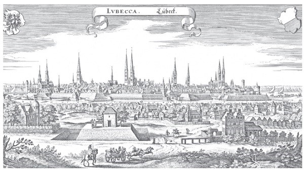 20 доехали до старинного города Штеттина, в 4 милях, где по случаю большого снега оставались с 21 по 23 число. Здесь любекские делегаты, отдельно от других, не только с почетом были приняты двумя представителями городской ратуши, но и удостоены поднесения 1 ома[18] вина, 4 штофов горячительных напитков, 2 диких коз, 2 чанов рыбы и, наконец, 18 шеффелей[19] овса.