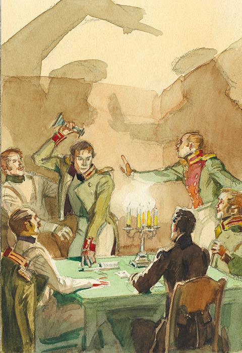 – Я с ним дрался, – отвечал Сильвио, – и вот памятник нашего поединка.