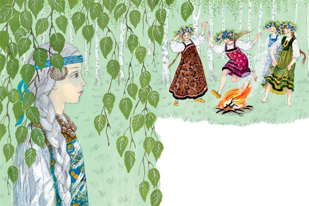 Подружки по лесу ходят, ягоды собирают, цветы рвут, венки плетут, поют, пляшут, а Снегурочка встала под берёзку, в тень. Жарко ей. О зиме грустит она, о белом снеге.