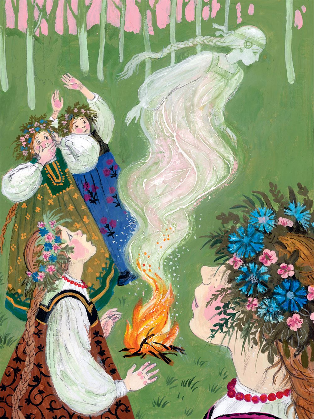 А подружки так развеселились, что набрали хворосту, разожгли костёр и стали через него прыгать. Смотрела на них Снегурочка, в стороне стояла. Подбежали к ней подружки, повели к костру, стали уговаривать: