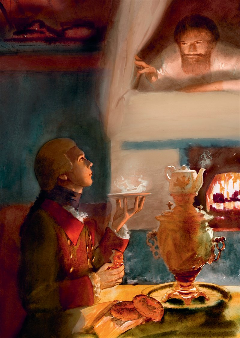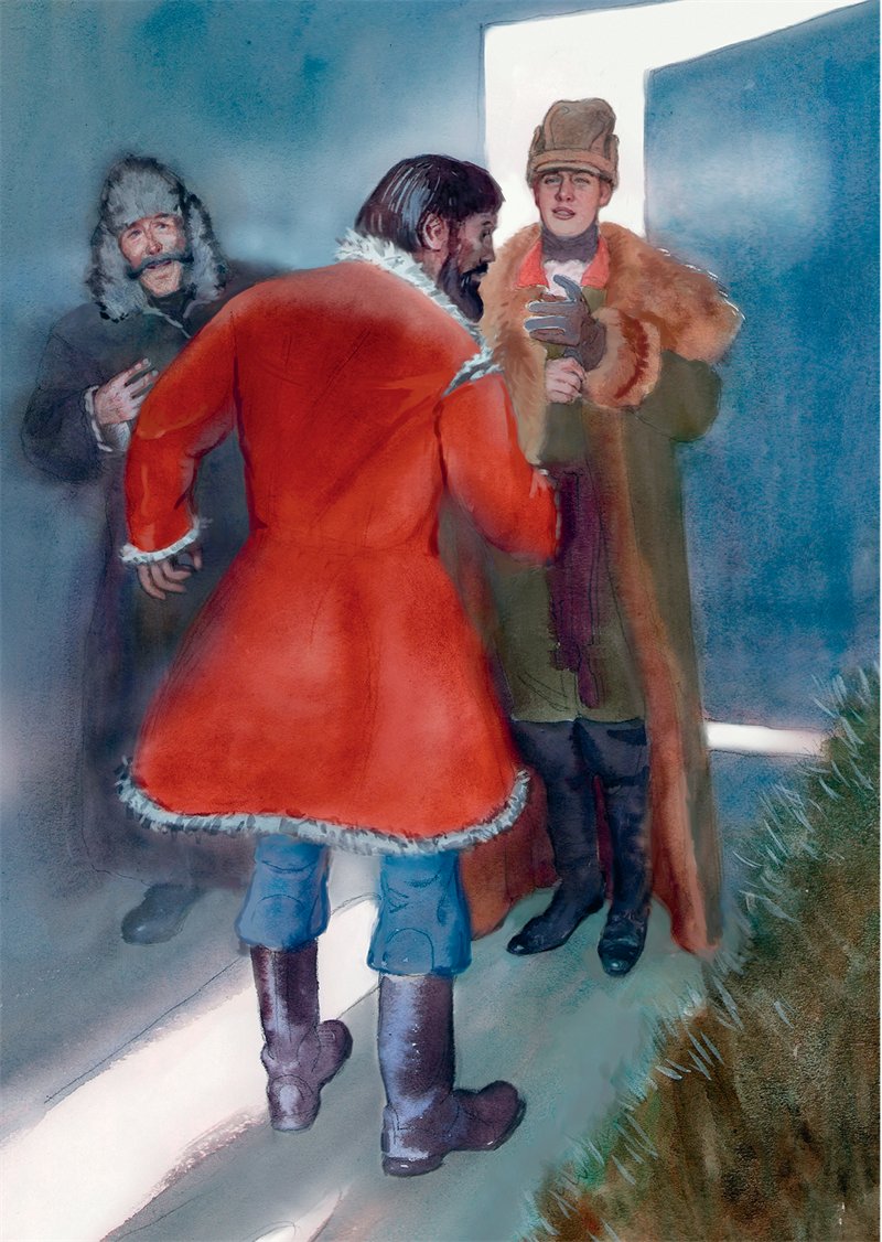 Проснувшись поутру довольно поздно, я увидел, что буря утихла. Солнце сияло. Снег лежал ослепительной пеленою на необозримой степи. Лошади были запряжены. Я расплатился с хозяином, который взял с нас такую умеренную плату, что даже Савельич с ним не заспорил и не стал торговаться по своему обыкновению, и вчерашние подозрения изгладились совершенно из головы его. Я позвал вожатого, благодарил за оказанную помочь и велел Савельичу дать ему полтину на водку. Савельич нахмурился. «Полтину на водку! – сказал он, – за что это? За то, что ты же изволил подвезти его к постоялому двору? Воля твоя, сударь: нет у нас лишних полтин. Всякому давать на водку, так самому скоро придётся голодать». Я не мог спорить с Савельичем. Деньги, по моему обещанию, находились в полном его распоряжении. Мне было досадно однако ж, что не мог отблагодарить человека, выручившего меня, если не из беды, то по крайней мере из очень неприятного положения. «Хорошо, – сказал я хладнокровно, – если не хочешь дать полтину, то вынь ему что-нибудь из моего платья. Он одет слишком легко. Дай ему мой заячий тулуп».