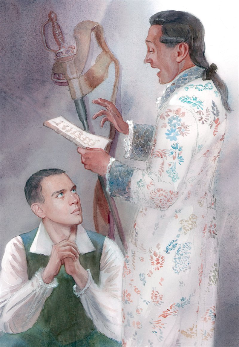 «Гм, понимаю… «и не давать ему воли»… нет, видно, ешовы рукавицы значит не то… «При сём… его паспорт»… Где ж он? А, вот… «отписать в Семёновский»… Хорошо, хорошо: всё будет сделано… «Позволишь без чинов обнять себя и… старым товарищем и другом» – а! наконец догадался… и прочая и прочая… Ну, батюшка, – сказал он, прочитав письмо и отложив в сторону мой паспорт, – всё будет сделано: ты будешь офицером переведён в *** полк, и чтоб тебе времени не терять, то завтра же поезжай в Белогорскую крепость, где ты будешь в команде капитана Миронова, доброго и честного человека. Там ты будешь на службе настоящей, научишься дисциплине. В Оренбурге делать тебе нечего; рассеяние вредно молодому человеку. А сегодня милости просим: отобедать у меня».