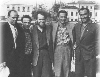 Поэты и друзья: Леонид Бурков, Александр Романов, Сергей Орлов, Михаил Дудин, Энгельс Федосеев на берегу Вологды. 1959 г.