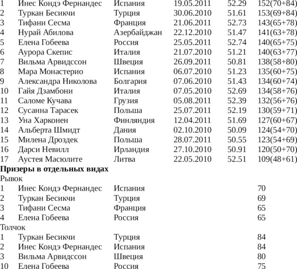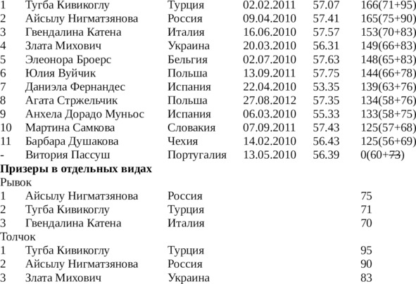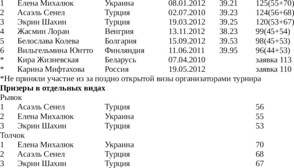 Айсылу Нигматзянова из башкирского Нефтекамска завоевала две малые медали – золотую в рывке и серебряную в толчке, и большую серебряную медаль в сумме, уступив всего 1 кг турчанке. Ее тренирует Илзира Усманова.