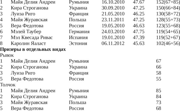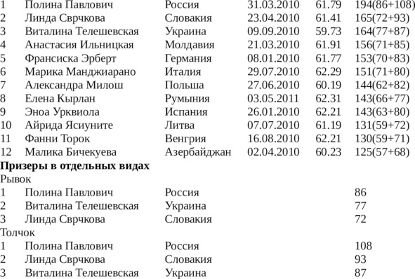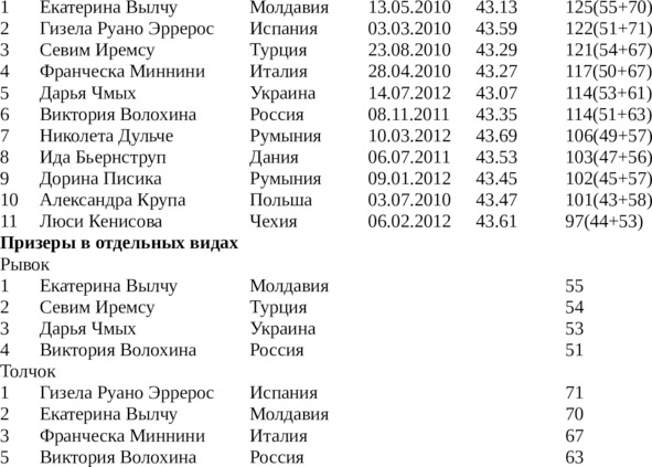 Полина Павлович из Холмска Сахалинской области стала обладательницей всех трех золотых медалей, двух малых в рывке и толчке и большой в сумме, не дав ни единого шанса соперницам. Надо сказать, что 15 летняя Полина Палович и в возрастной категории U-17 заняла бы 2 место. Блестящий успех талантливой спортсменки, которую тренирует Максим Шейко!