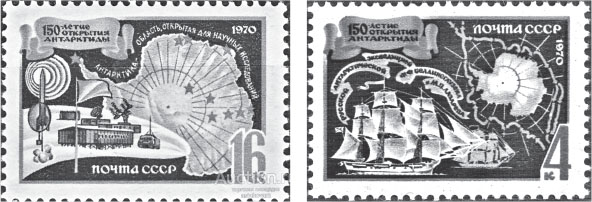 Почтовые марки СССР 1970 года, посвящённые 150-летию открытия Антарктиды. 1-я – с картой маршрута русской антарктической экспедиции; 2-я – Антарктида – область, открытая для научных исследований. Как видим – ни слова о «советских (российских) антарктических территориях».