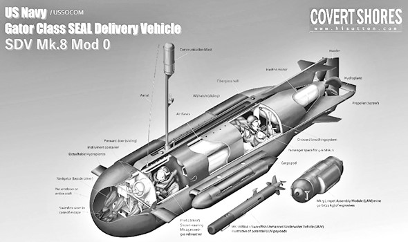 СМПЛ МАРК-8 Моd1 SDV. Носитель-транспортировщик боевых пловцов можно перевозить на автоплатформе. Габариты: длина 6,4 метра, диаметр 1,8 м, водоизмещение 18 тонн, электродвигатель, аккумулятор литий-ионный, аппарат имеет один винт, экипаж 2 человека, скорость 6 узлов; зарядки аккумулятора хватает на 10 часов работы, автономность 30 км. СМПЛ МАРК-8 работает с большими АПЛ типа «Лос-Анджелес».