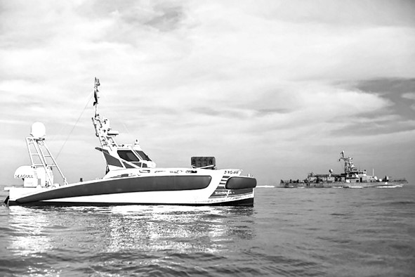 Беспилотный надводный корабль Elbit Systems Seagull работает вместе с патрульным кораблем USS Monsoon в Персидском заливе во время маневров Digital Horizon 2022*.