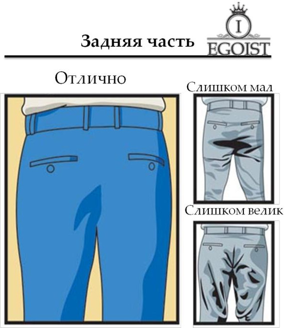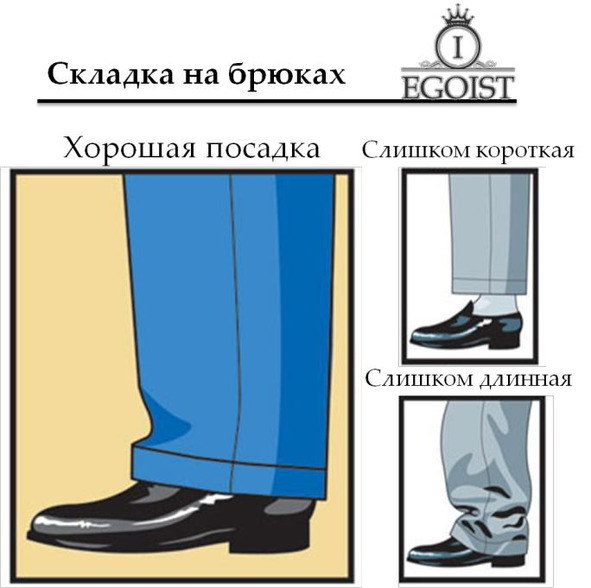 Часто длину делают с запасом – так ты сможешь обратиться к портному и подшить их до нужной длины. Мерять длину брюк следует иначе, чем джинсов – на надетую обувь. Край брюк должен едва касаться ботинок, а в длину брючина должна быть от половины до 2/3 длины ботинка (см. рисунок). Шов по центру брючины должен плотно прилегать к твоей ноге – иначе брюки будут висеть мешком.
