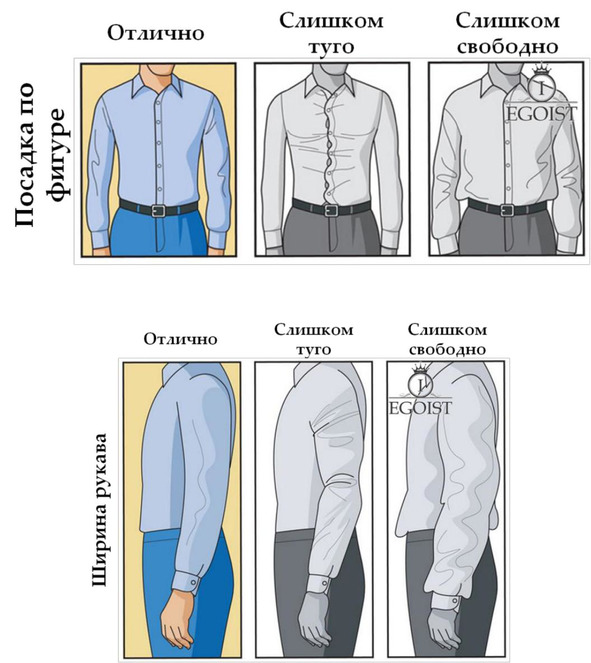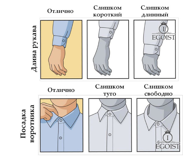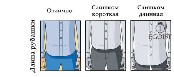 Длина рубашки. Идеально – десять-пятнадцать сантиметров ниже ремня. При таком размере сорочка идеально подойдёт для заправки в брюки – см. рисунок.