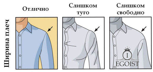 Обычно размеры рубашки отличаются сразу в двух измерениях – воротник и рукав. Это облегчает подбор рубашки к костюму. Критерий подходящего размера тот же, что у футболки и поло – шов посередине плеча. Что касается воротника – при правильном размере он легко застёгивается, ткань не пузырится, рубашка не натягивается и не висит. При ношении с пиджаком воротник рубашки должен слегка, на несколько см, торчать из-под воротника пиджака.