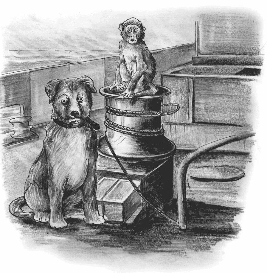 С каждым днем, преодолевая робость, Додик приближался к Зине ближе и ближе. И вот наконец наступил день, когда он смог подобраться к ней на расстояние вытянутого носа. Зина сидела на палубе, опершись на кнехт, и самозабвенно грызла голову только что пойманной рыбы. Додик осторожно подкрался по ватервейсу и высунул морду из-за кнехта. Зина вздрогнула, бросила рыбу с отгрызанной головой и заскочила на кнехт. Додик акулой кружил вокруг кнехта, поскуливая и пытаясь достать ее лапой, но обезьяна ловко уворачивалась.
