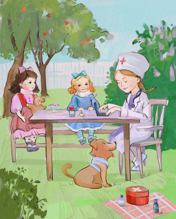 – Вот вам рецепт, больная, – Маша аккуратно положила сложенный листок с описанием лекарств под вторую ручку куклы, – принимайте аккуратно, как я написала, и через три дня будете здоровы!