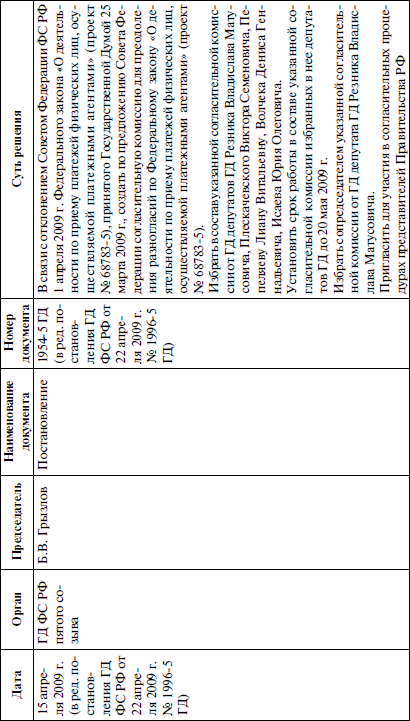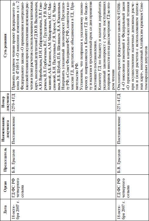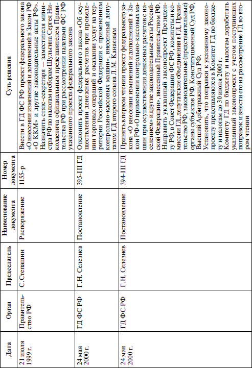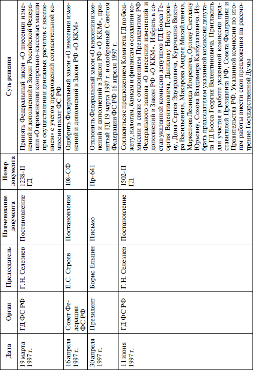 21 февраля 1996 г.). 19 и 26 апреля 1996 г. ГД ФС РФ принимает соответственно в первом и окончательном чтениях Федеральный закон «О внесении изменений и дополнений в Закон Российской Федерации «О ККМ» и направляет его в Совет Федерации ФС РФ (постановления ГД ФС РФ № 280-П ГД от 19 апреля 1996 г. и № 321-П ГД от 26 апреля 1996 г.). Совет Федерации ФС РФ во главе со своим Председателем Е.С. Строевым 15 мая 1996 г. постановлением № 155-СФ одобряет принятый Федеральный закон, который отклоняется Президентом РФ. Затем 17 июля 1996 г. ГД ФС РФ вновь принимает указанный Федеральный закон с учетом предложений Президента РФ и вновь направляет его в Совет Федерации. Дальнейшее движение законотворческого процесса в связи с принятием комментируемого Закона рассмотрим в виде таблицы:
