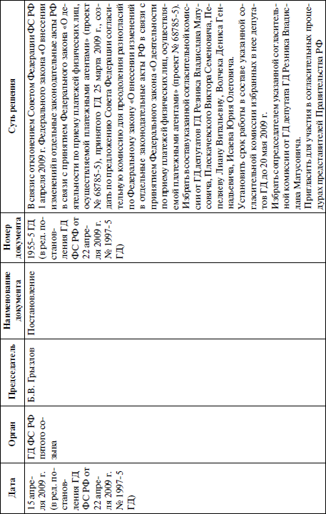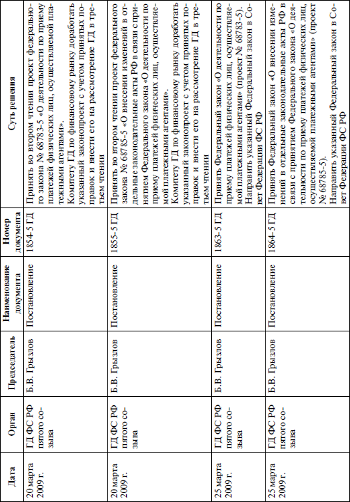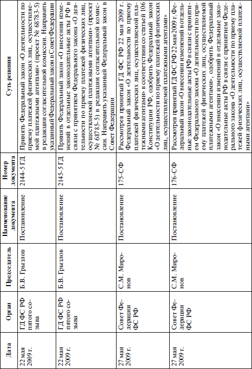 В результате 3 июня 2009 г. Президент РФ Дмитрий Медведев подписывает Федеральный закон «О деятельности по приему платежей физических лиц, осуществляемой платежными агентами» и одновременно с ним Федеральный закон «О внесении изменений в отдельные законодательные акты РФ в связи с принятием Федерального закона «О деятельности по приему платежей физических лиц, осуществляемой платежными агентами», которым присваиваются соответственно № 103-ФЗ и № 121-ФЗ. Статья 4 Федерального закона «О внесении изменений в отдельные законодательные акты РФ в связи с принятием Федерального закона «О деятельности по приему платежей физических лиц, осуществляемой платежными агентами» вносит серьезные изменения в комментируемый Закон. Вот текст этих изменений: