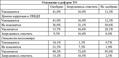 Один из главных аргументов сторонников реформы – снижение коррупции (в это верит 41 % из числа одобряющих против 12 % из числа не одобряющих реформу техосмотра респондентов), так как чем меньше общаешься с сотрудниками ГИБДД, тем реже приходится давать им взятки. Противники законопроекта возражают: сэкономить на техосмотре все равно не удастся. Как только к этой процедуре допустят страховые компании, официальные расценки сразу же устремятся вверх (в этом уверены 95 % из числа не одобряющих против 49 % из числа одобряющих реформу техосмотра респондентов). Владельцам же «убитых» авто для признания своего металлолома годным к употреблению, вероятно, снова придется решать вопрос неофициальным путем.