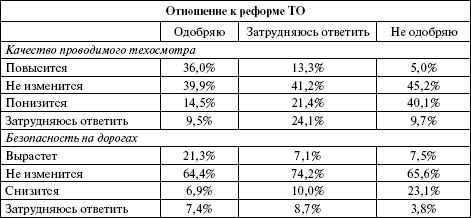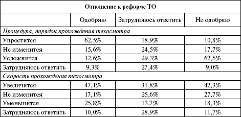 Позиция опрошенных пользователей в незначительной степени зависит от того, к какому классу относится автомобиль, который находится в личном владении/пользовании респондента. Одобряют реформу техосмотра 24–27 % водителей автомобилей компактного, малого и нижнего среднего классов против 30–34 % водителей автомобилей среднего и более высоких классов.