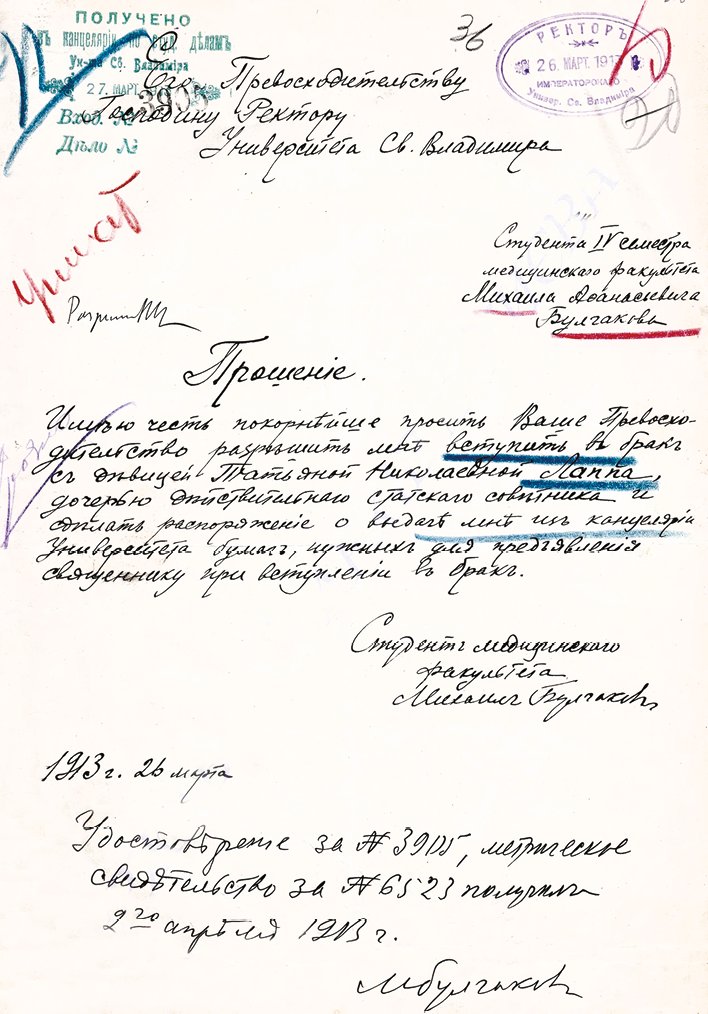 Прошение студента М. А. Булгакова ректору Киевского университета разрешить ему вступить в брак