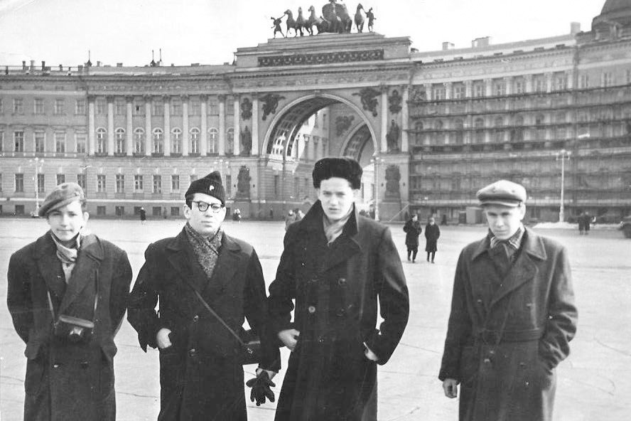 На Дворцовой площади с друзьями-одноклассниками. Слева направо: Г. Ламм, В. Быстрийкий, я, И. Колисниченко