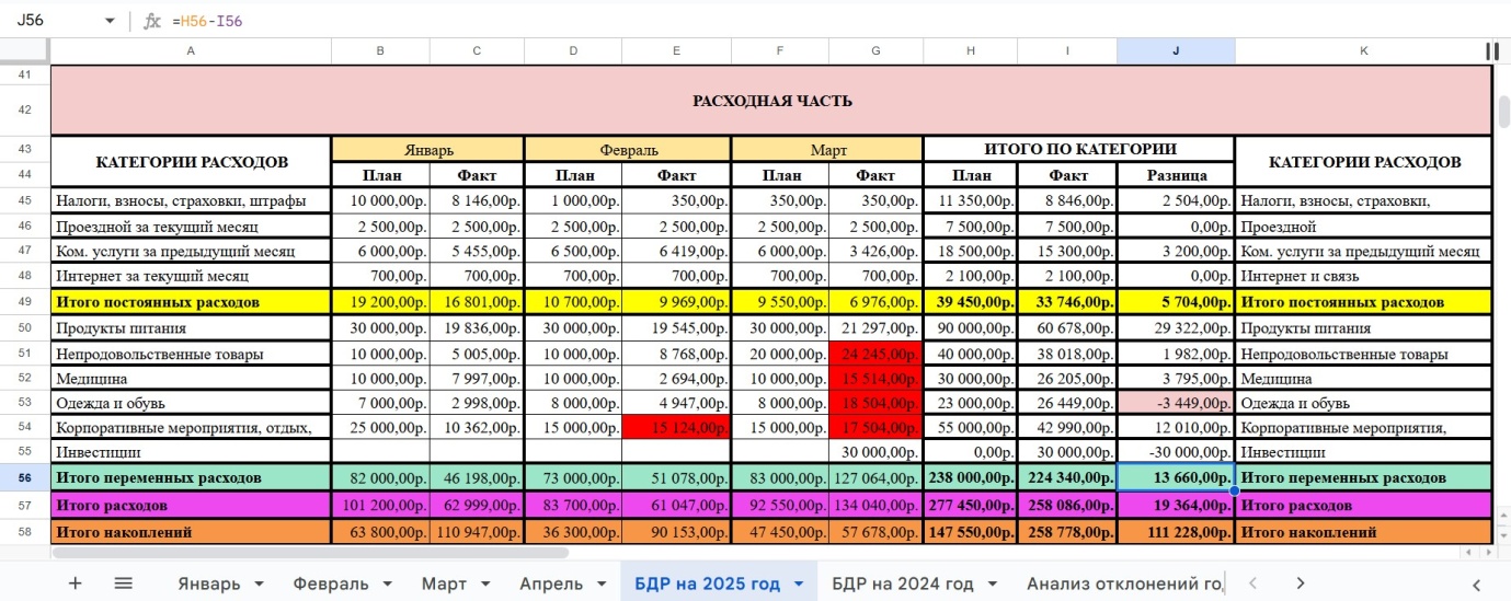 В столбце J считается разница между суммой плановых значений по категориям и суммой фактических расходов по категории за квартал. При этом в ячейках H56 и I56 приведена сумма плановых и фактических итоговых переменных расходов (сумма значений соответствующих диапазонов с Н50 по Н55 и с I50 по I55). А в ячейке J56 сумма подсчитана как разность между значением ячеек H56 и I56 – то есть между суммой всех плановых и всех суммой фактических переменных расходов за период. И как мы видим эта сумма (13 660 рублей) аналогична сумме, рассчитанной в ежемесячном отчете за март.